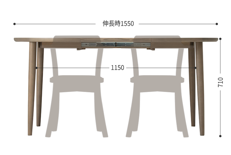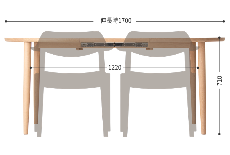 伸縮時は2〜4人で、広げた時には椅子が6脚収まります。シルエットは、巾555mmのルントオム チェアー2脚を収めた際のイメージ。