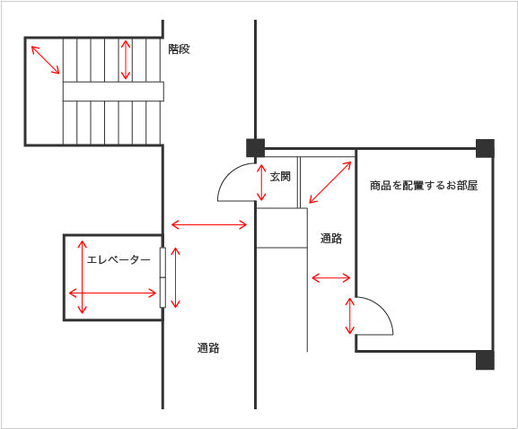 ※横幅の大きい商品でも天井までの高さに余裕があれば、商品を立てて搬入することができますので、事前にご確認いただけますようお願いいたします。
