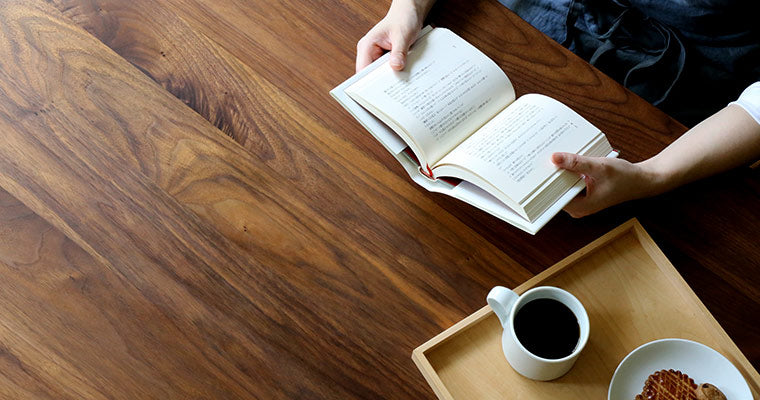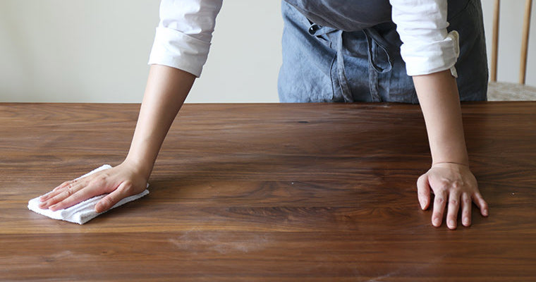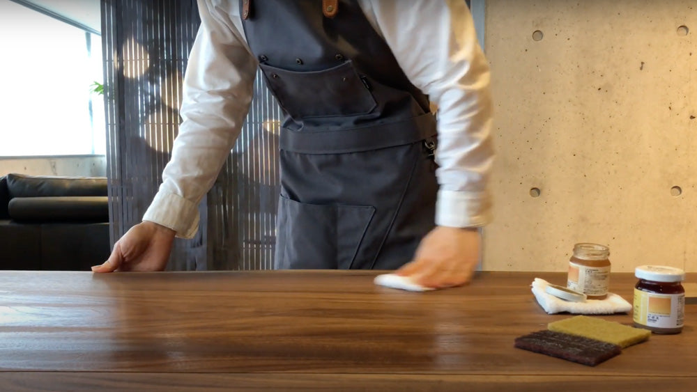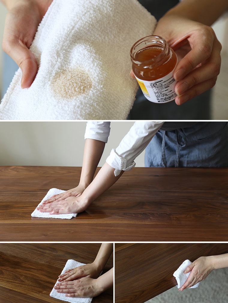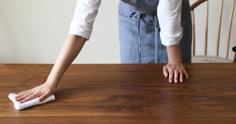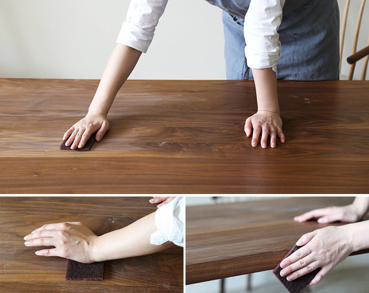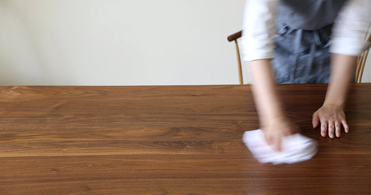 乾いた布にオイルを含ませ木目に沿って全体に薄く擦り込みます。ムラにならないようご注意ください。天板の側面(小口)も忘れずに塗ります。