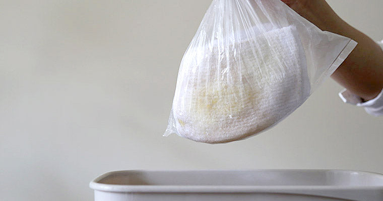 オイルが付着した布を完全に水に浸してからポリ袋に入れ、袋内の空気をできるだけ外に出してください。