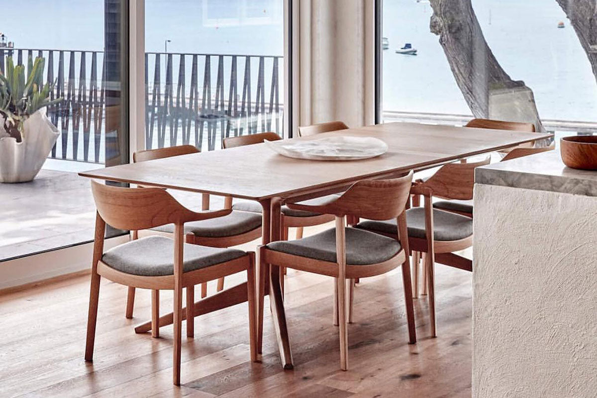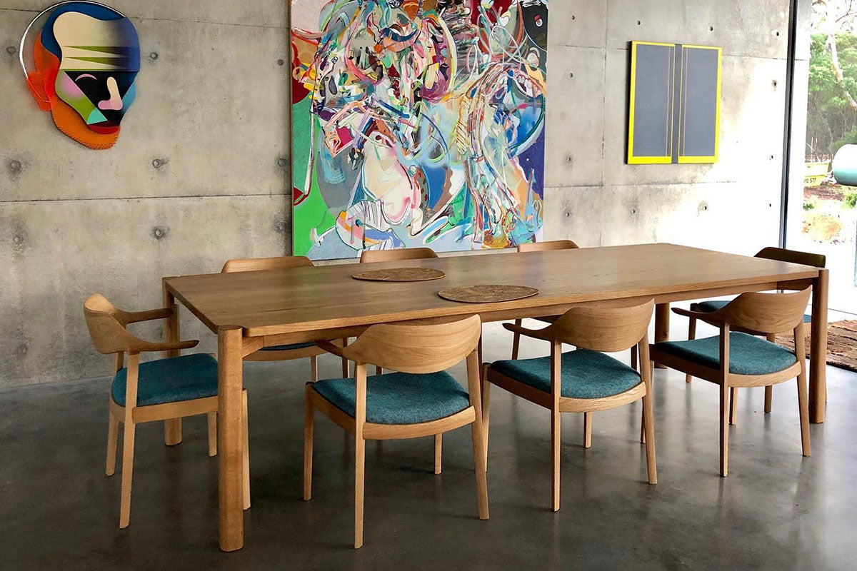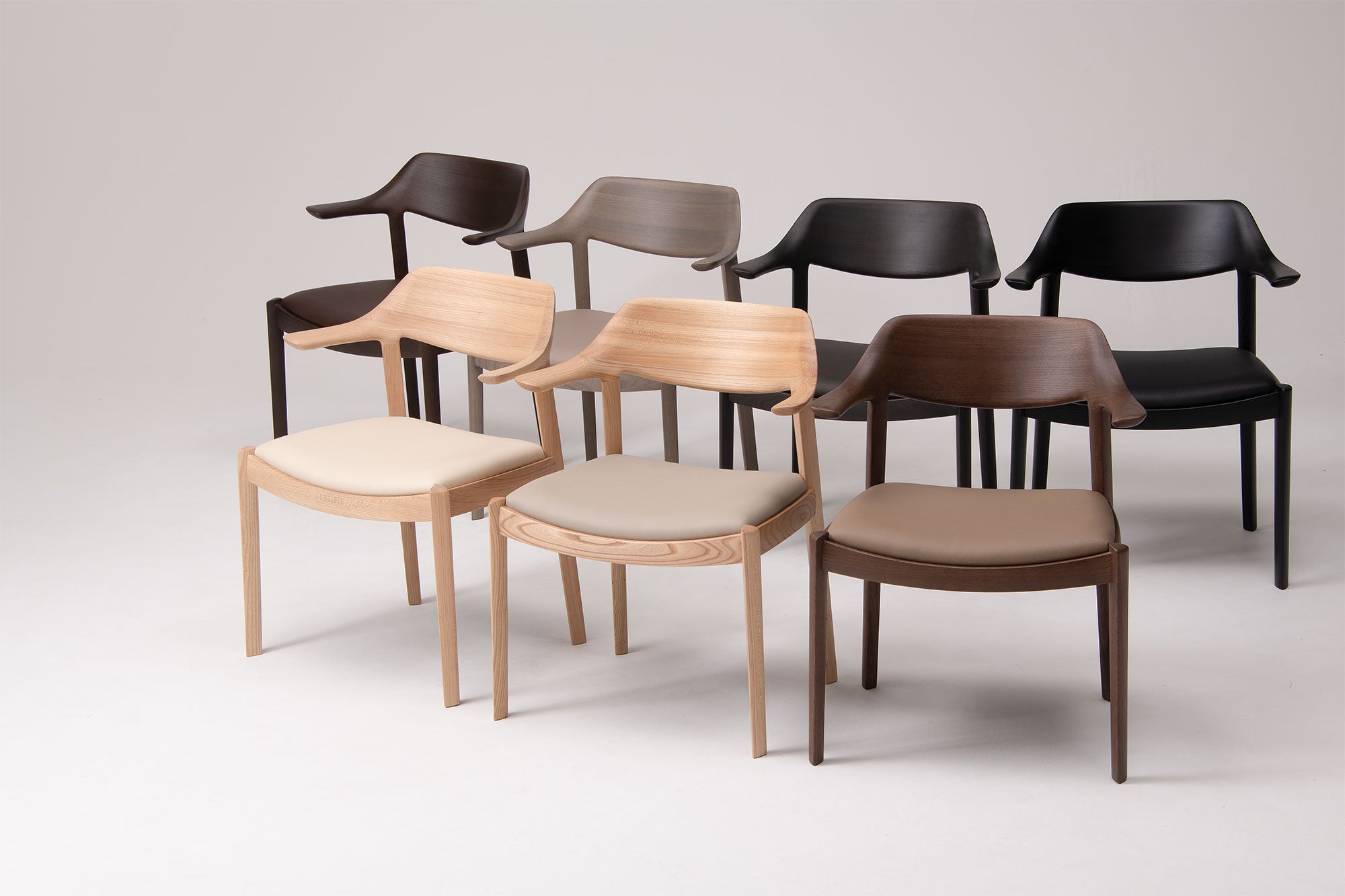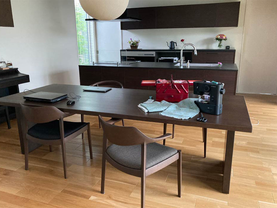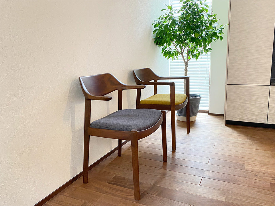 合わせる張地はダーク色の布や革もよく合い、木目がスッキリしているので柄モノの張地も上品に仕上がります。また、MBRの塗装色はウォルナットに似た色合いで、ウォルナットよりも落ち着いた印象のコーディネートが可能です。