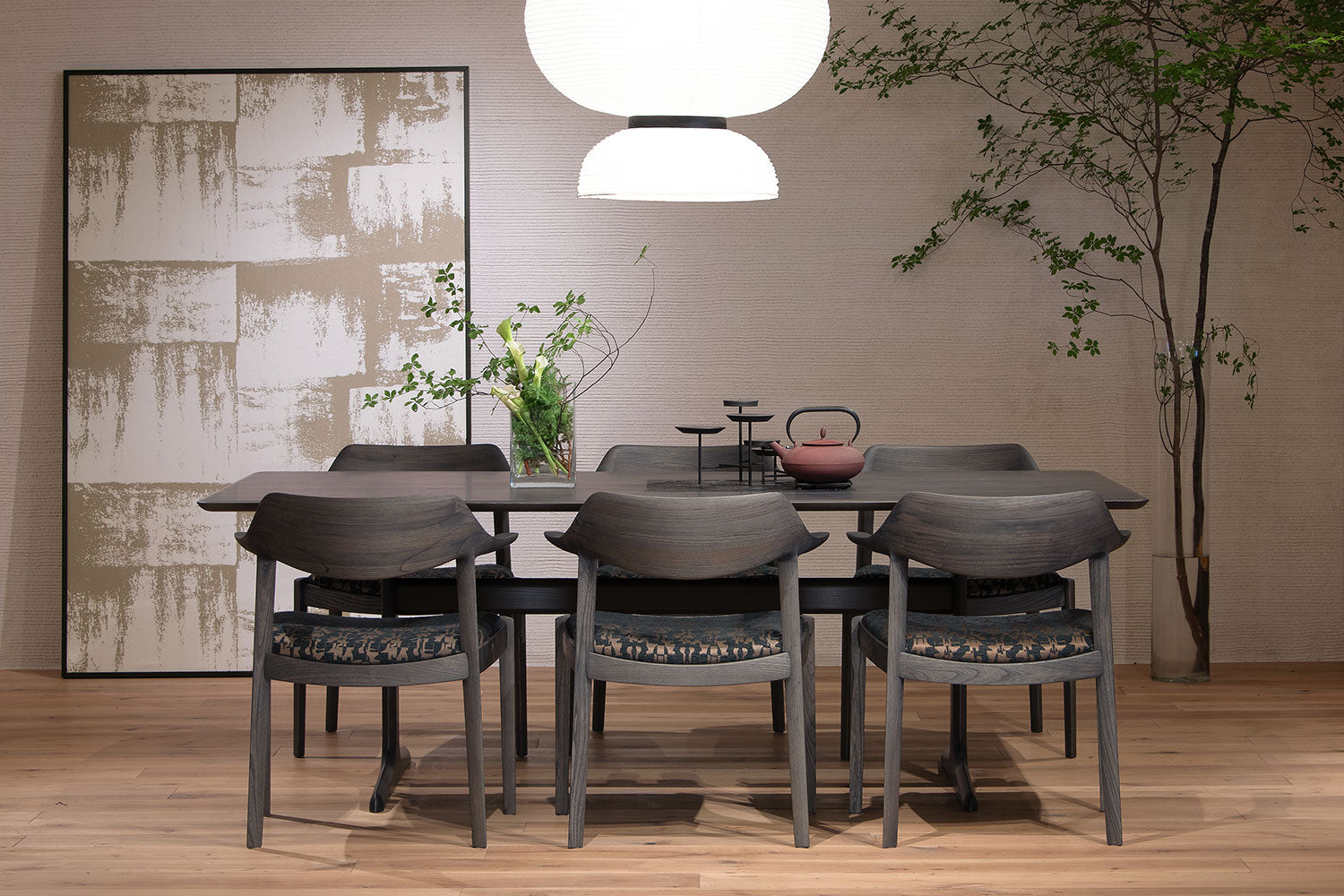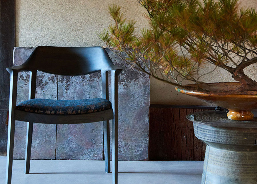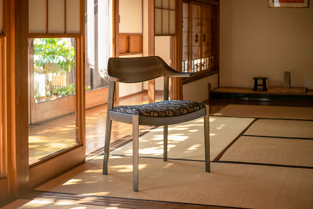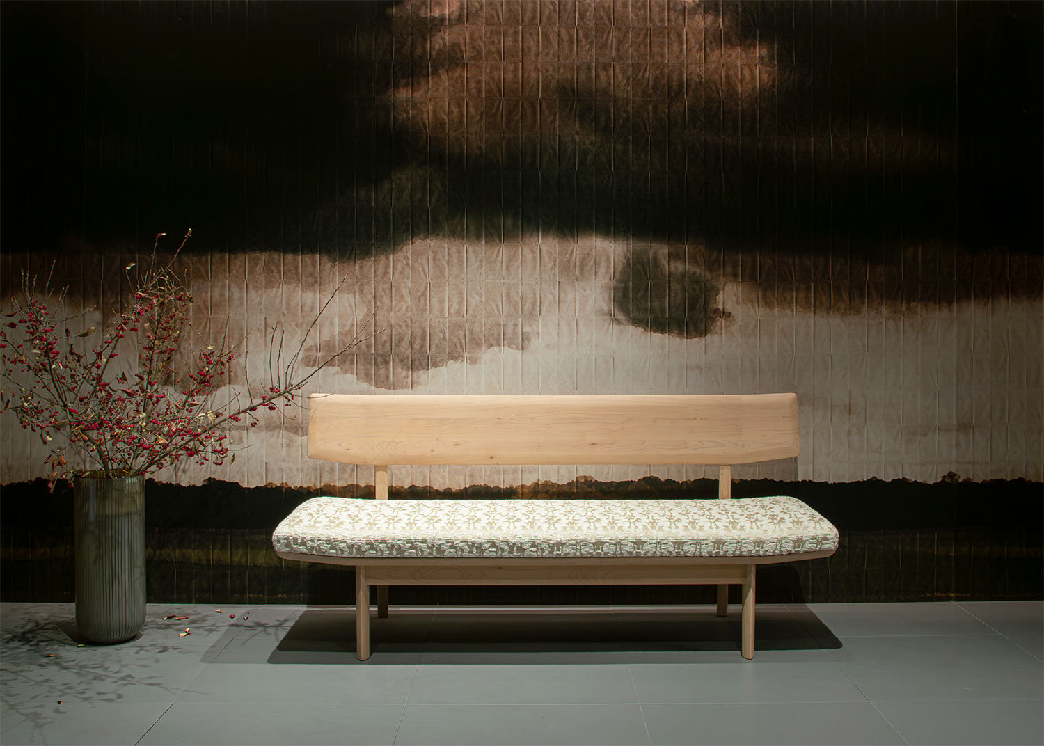 光沢のある糸とナチュラルでマットなブークレ糸が、リッチで洗練された印象を与える張地。サクラの赤みを帯びた生成り色と調和し、穏やかで気品ある空間を演出します。