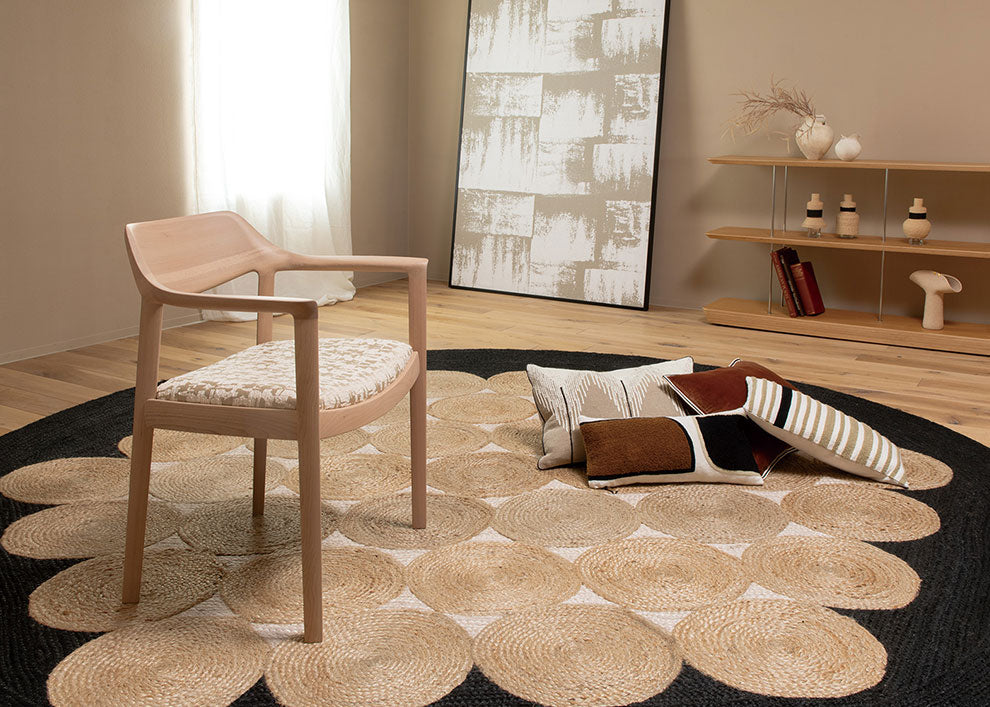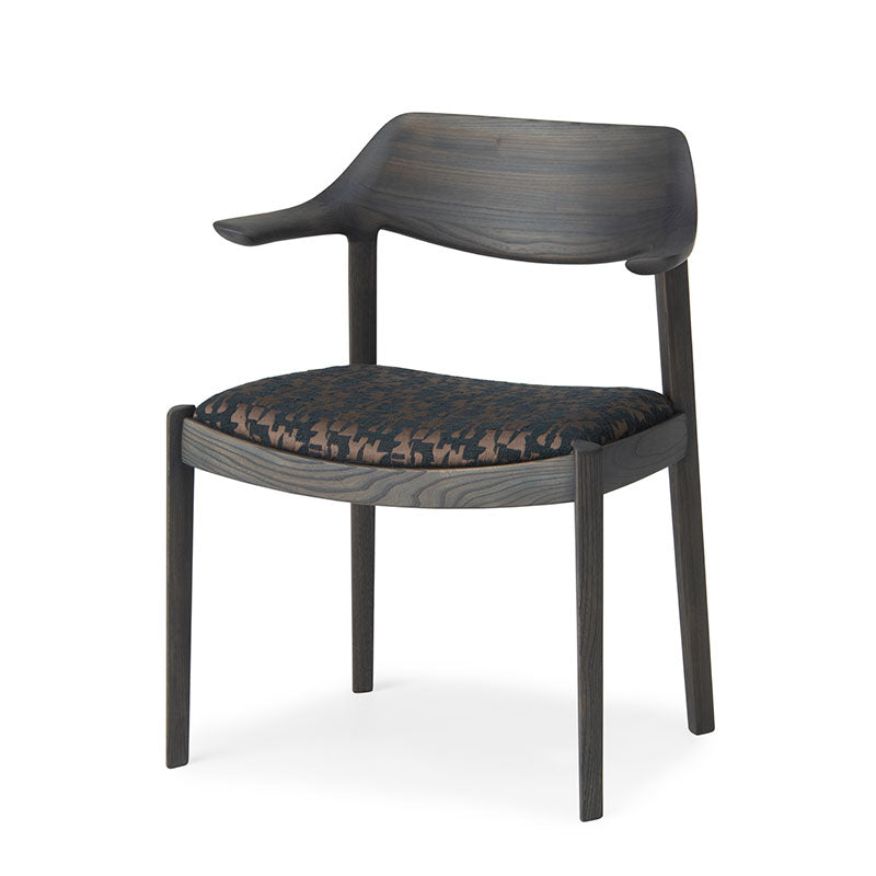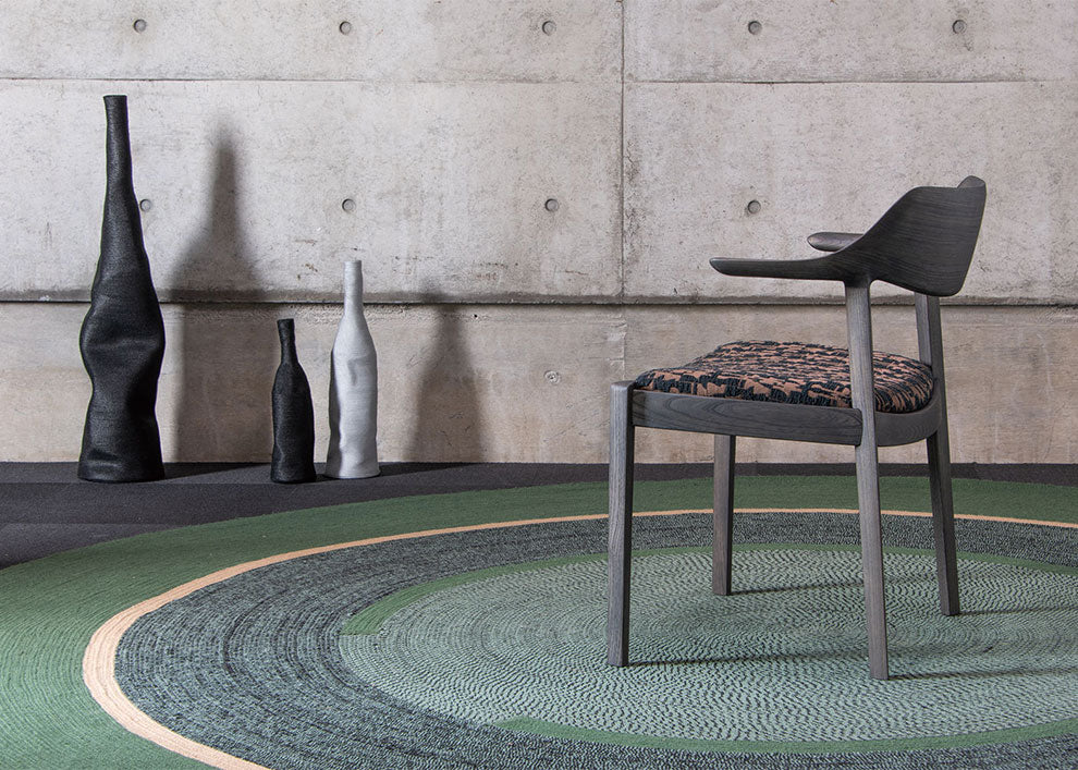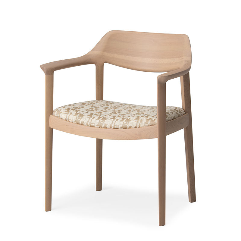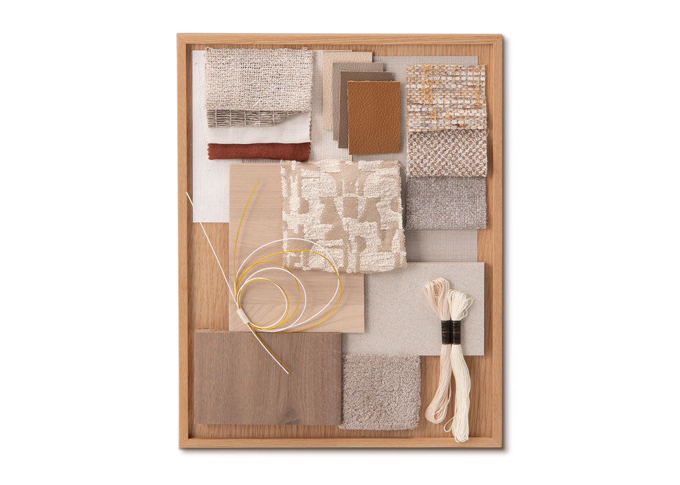光沢のある糸とナチュラルでマットなブークレ糸が、リッチで洗練された印象を与える張地。サクラの赤みを帯びた生成り色と調和し、穏やかで気品ある空間を演出します。