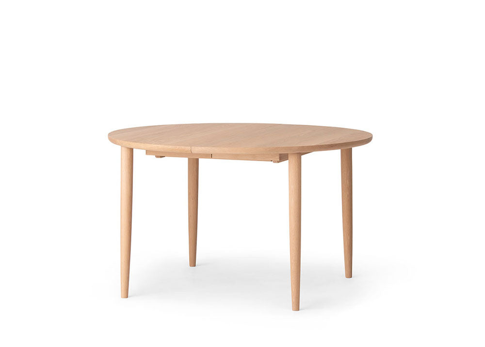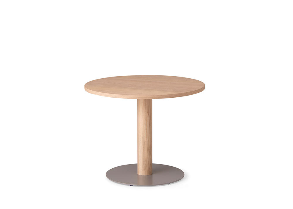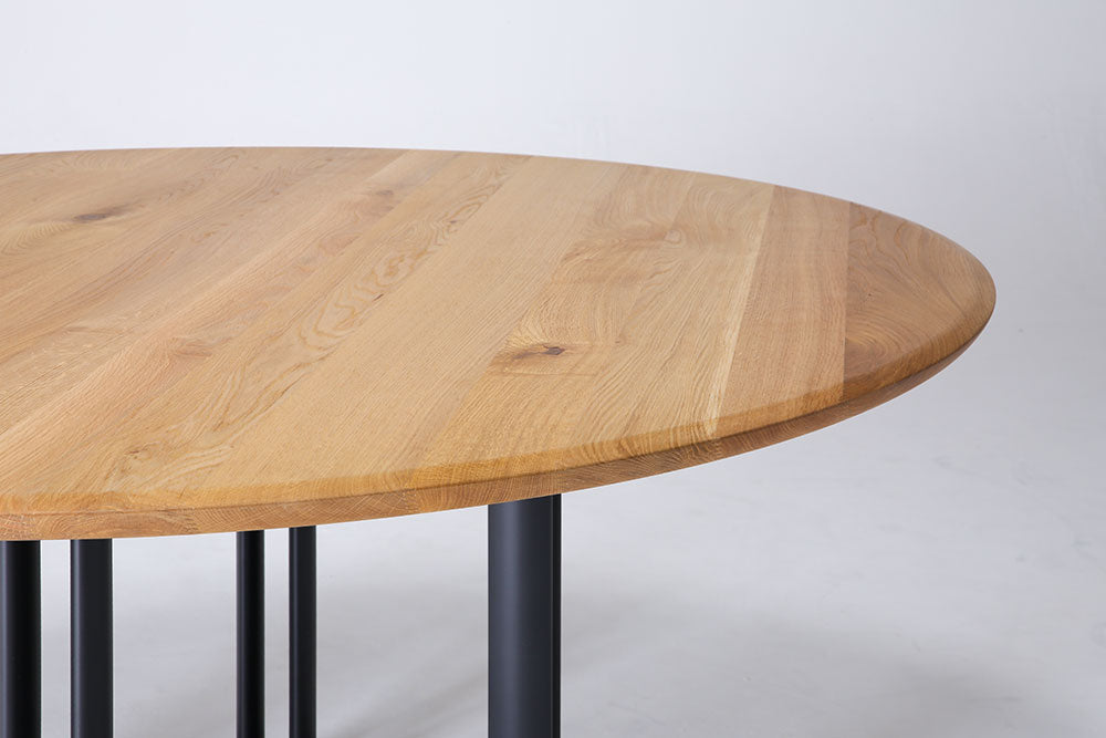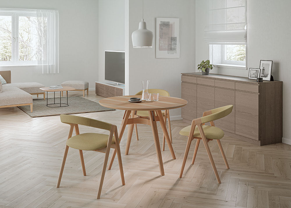 φ90サイズから選べる、スタイリッシュな脚部が魅力のラウンドテーブルです。丸形は空間に圧迫感を与えにくく、家事動線もスムーズ。脚まわりにゆとりがあり、複数人でも使いやすいデザインです。天板には突板ランダムマッチ貼りを採用。無垢テーブルよりも軽量で移動しやすい点も特長です。