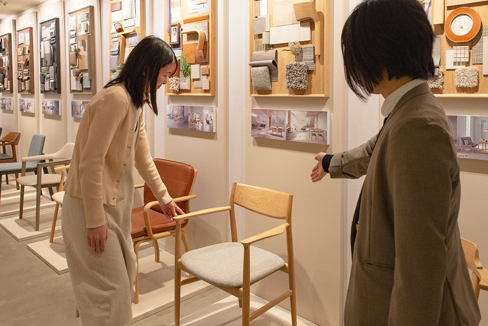 使い心地や質感、椅子との組み合わせなどを、見て、触れて、暮らしを考える。