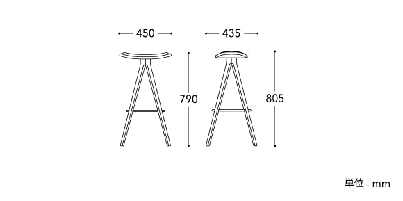 使用しているのは北海道産のタモ材。強度と粘りを持ち木目が安定しているのが特長で、きれいに伸びる4本の脚を、上質な木の美しさがさらに引き立てています。リング状に取り付けたスチール製の足掛けは、必要最小限でしっかりとサポートします。
