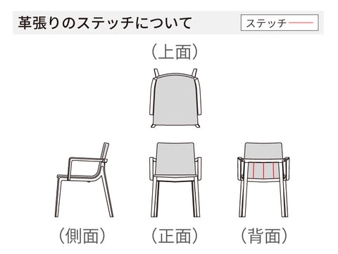 アームは椅子の幅が広がらないよう、細く短めに設計。背裏の木部には手掛穴があり、椅子を引きやすく、アームにより立ち座りや出入りもしやすいと機能的な一脚です。