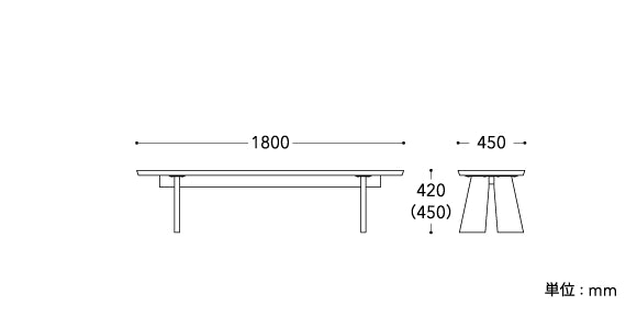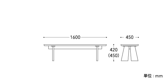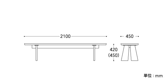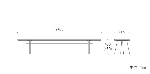 堂々と立つ武士の「袴」姿から発想した、凛とした力強いデザインが特長です。脚部は、袴の折り目をイメージした美しい波模様。下へいくほど溝を太く彫り込んで末広がりの形状を自然に表現しています。ベンチはテーブルと組み合わせるだけでなく単体で置いたり、ホールなどの大空間に並べると存在感を発揮します。