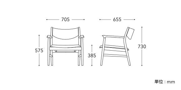より低い位置でゆったりくつろげるリビング向けの一脚です。安楽椅子の“いちばんいい角度”とやわらかさを背と座で追求。脚はやや太めで、角度を寝かせて全体に安定感を持たせました。アームもエッジを立たせながら手触りはなめらかな、絶妙なバランスです。クッション性のある背張タイプ。