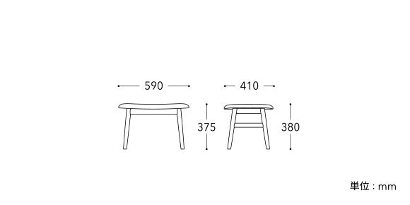 高さは380mmと低めの設定、幅は590mmで座面はたっぷりと広めのスツールです。座の絶妙な曲面で座り心地もよく、スツールでありながら長時間ゆったりと座ることができます。