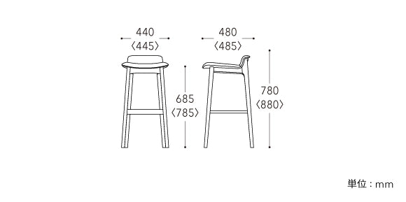 まっすぐに立ち上がる長い脚が目を引くハイスツールは、北海道産タモ材の質感を際立たせ、空間をすっきりと知性的な雰囲気で満たします。体をふっくらと支え安定感もあるシェル型の座は、全体のシャープな印象を崩さないよう縁をなだらかに削り、エッジを効かせて張り込みました。