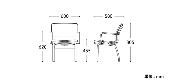 座から背にかけてボリュームを抑えたクッションを張り込み、安楽性を高めています。腰を支えながらやや後傾した背、座面のゆるやかなカーブといった、人の体を受け止める微妙な形状が腰掛けた人の姿を美しく見せてくれます。