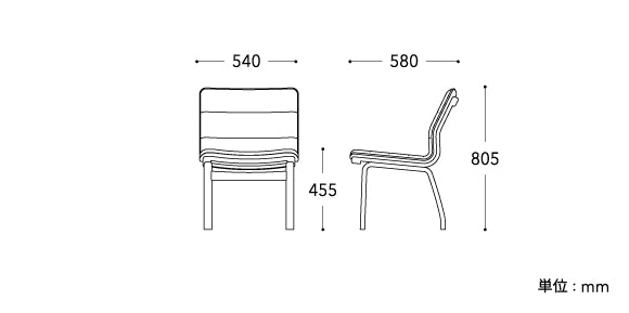 座から背にかけてボリュームを抑えたクッションを張り込み、安楽性を高めています。腰を支えながらやや後傾した背、座面のゆるやかなカーブといった、人の体を受け止める微妙な形状が腰掛けた人の姿を美しく見せてくれます。
