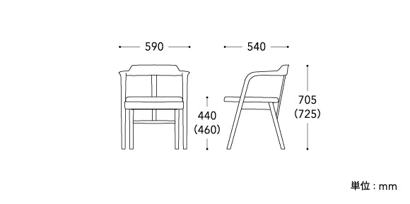 背から肘、脚へと流れる1本の美しい無垢材パーツに、北海道産広葉樹の特色が生きています。背の細い支柱は、今までにない形状へのチャレンジ。華奢にみせつつ強度を保つと同時に、視覚的に静かな緊張感を生み出しています。