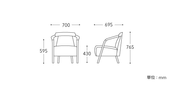 脚から肘、背、そしてもう一方の脚までが自然に繋がるパーツ。ゆったりと体を預けられ、ほしいところにほどよく触れる「体の延長としての椅子」を目指したデザインです。腰を心地よく支えるクッションと、肩まわりに位置する木背のバランスは特に大切にした点。技術担当者と喜多氏が試作を繰り返して、粘土を形づくるような作業の中から生み出したものです。座の厚みで視覚的に安定感を与えながら、その立体感とアームや座の丸みのバランスが独特な雰囲気を醸しています。