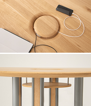 直径最大2400mm、厚さ34mmの迫力あるラウンドテーブル。天板は無垢のダイナミックな木目とシャープな面形状で、3色から選べる金属脚とも好相性。家具というより建造物に近い存在感です。配線をきれいに収納できるワイヤリングオプションなど、高まるオフィス需要にも対応しています。