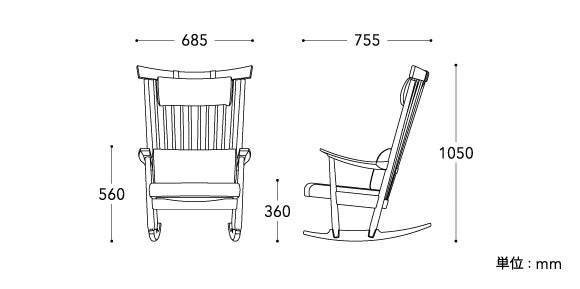 日本を代表するプロダクトデザイナー、渡辺力氏のロッキングチェアー。重心と揺れの絶妙なバランスに、氏のこだわりが光る一脚です。やや低い座面と厚みのあるクッション使いで、安楽性を確保。先端をすとんと切り落とした肘のフォルムも、緊張感のある姿を引き立てています。