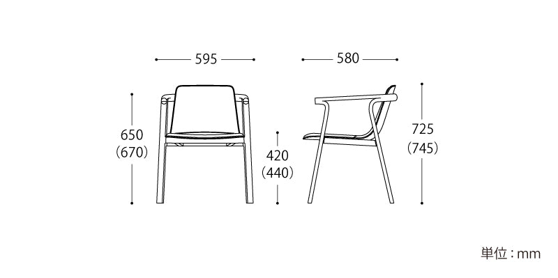 シェル型の座面は全体のシャープな印象と異なり、座ってみるとゆったりと包み込まれる感覚があります。幅と奥行きともに広めの座面で安定感があり、シワ無く張られた張地の縫製(ステッチ)が意匠のポイントになっています。